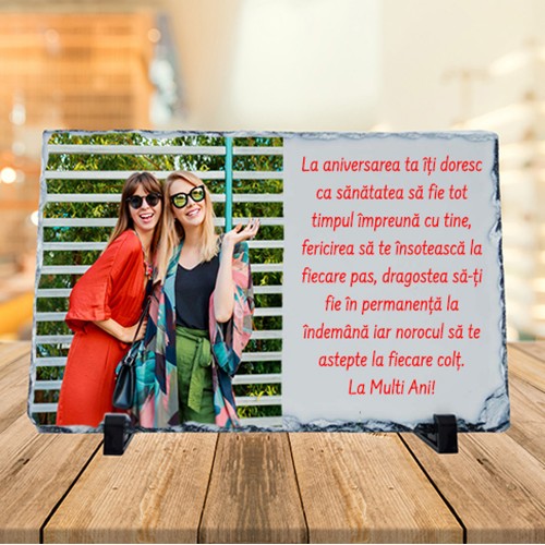 Acest cadou va fi ?ntotdeauna unul special, potrivit pentru numeroase ocazii. Placa ardezie este un cadou ideal care ofera intensitate pozelor datorita suprafeșei lucioase de o calitate superioara. Aceasta ?și poate gasi locul ?n spașiul unei casei sau birou de servici. ?n funcșie de formatul pozei aceasta se poate așeza pe suport ?n pozișie verticala sau orizontala.