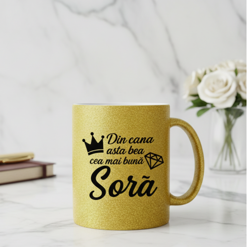 Cauți cadoul perfect pentru sora ta specială? Această cană aurie, cu sclipiri, este alegerea ideală pentru a-i arăta cât de mult o apreciezi! Mesajul "Din cana asta bea cea mai bună Soră" este un omagiu adorabil, completat de o coroană elegantă și un diamant strălucitor, simbolizând valoarea inestimabilă a legăturii voastre.